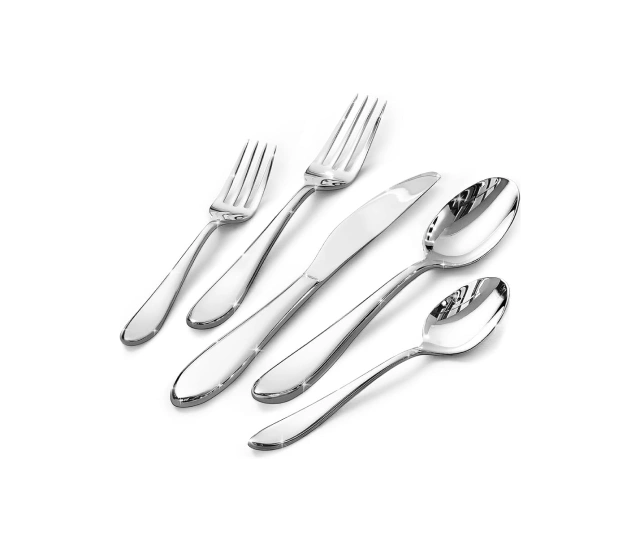 Garfos, facas e colheres em aço inox polido. Sets completos para cada convidado.